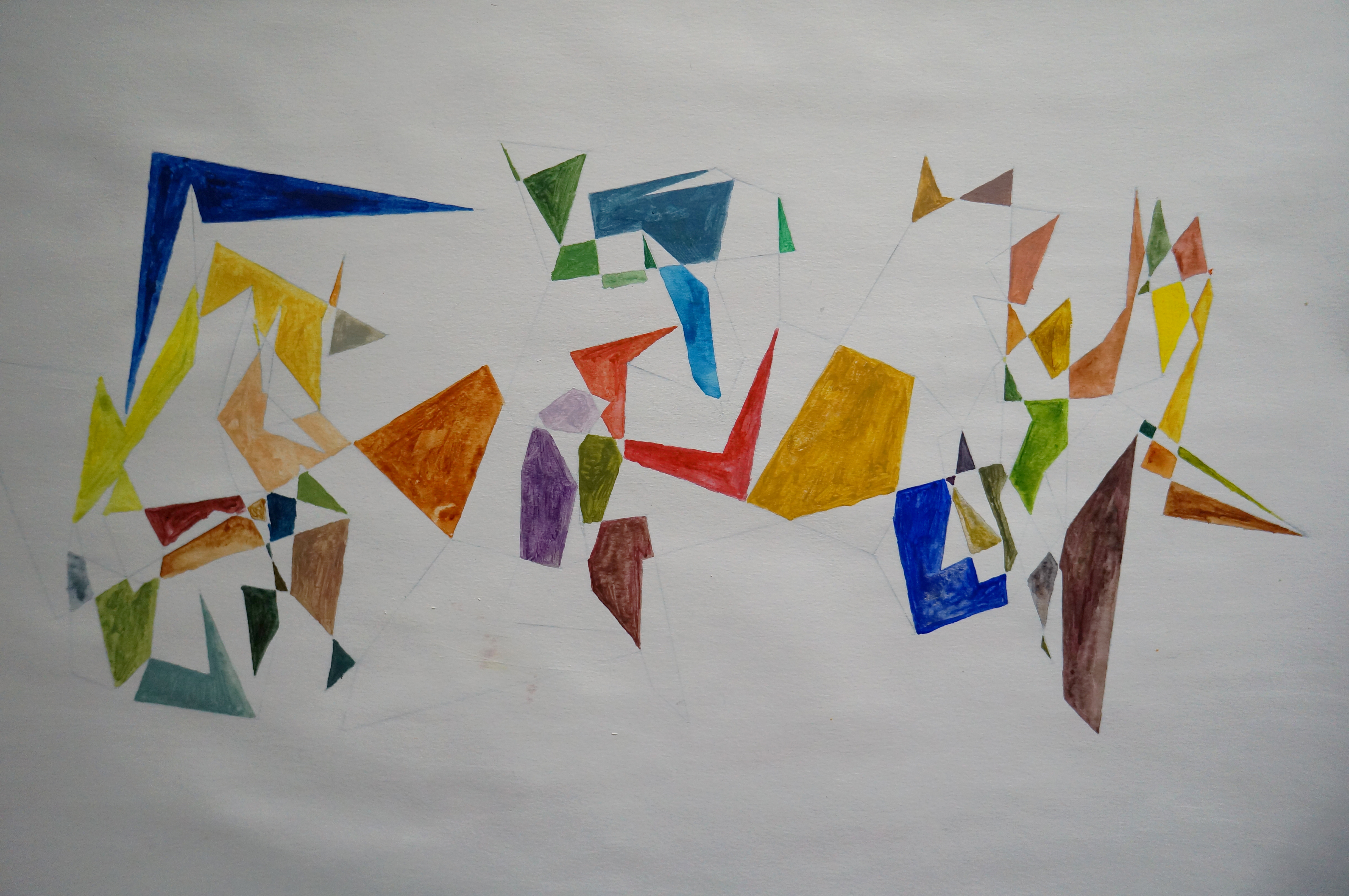 Having thought about the use of shape and line within constructivist works, this time I decided to put the drawing underneath a priming layer, also using this as a way of stretching the paper before painting to hopefully reduce the surface distortion that occurs as paper is wetted.