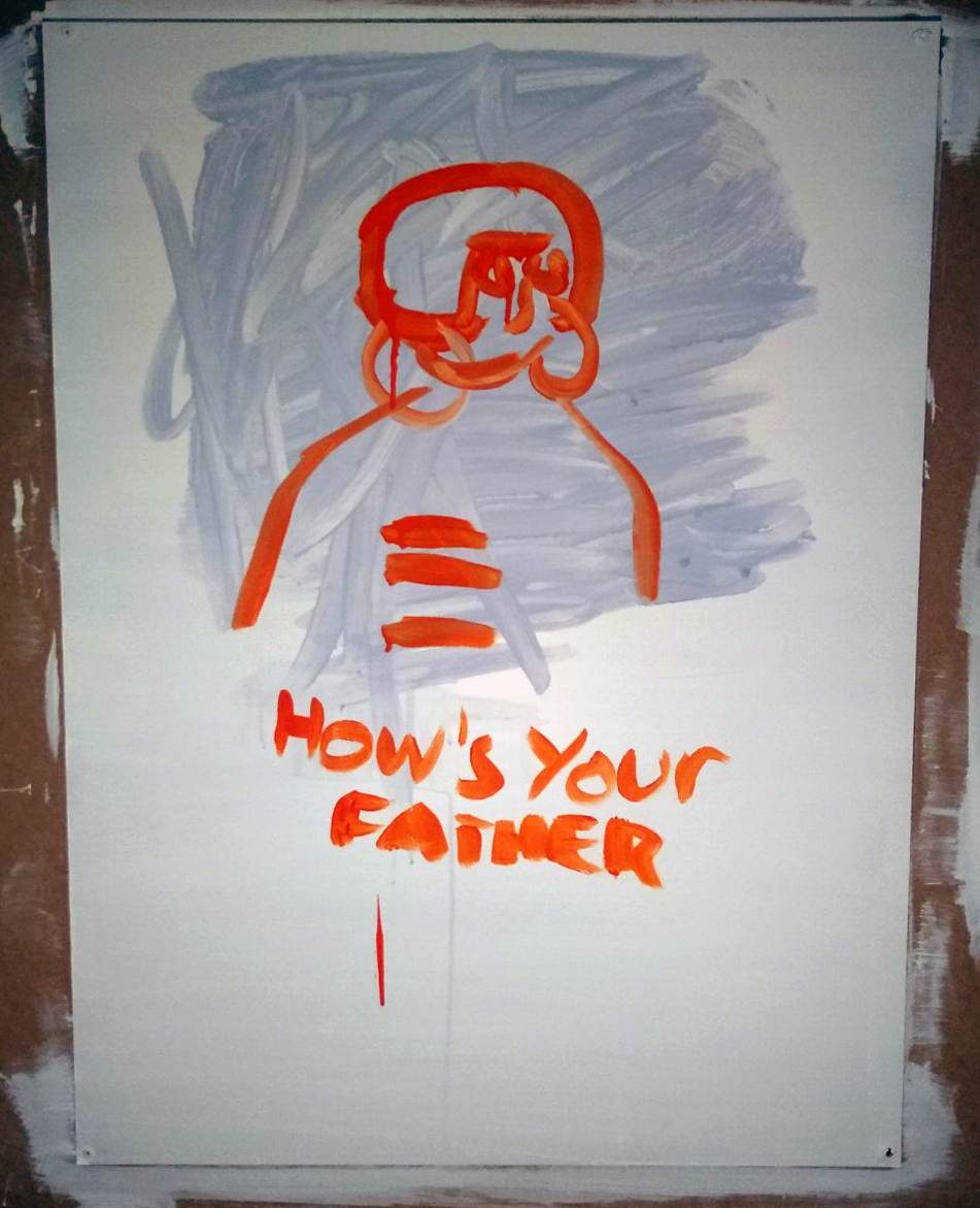 I couldn’t sleep one night, went downstairs, put a documentary about Francis Bacon on and worked out some angst. Again, this is an image that sprang out of the act of painting, rather than as a planned exercise. The strokes I was making started to form what I saw as plants/pubic hair, I then turned the imagery more into the former and tried to push the metaphor into the latter… what does it mean? I don’t truly know, only what I thought it did at the time. The addition of the sign I thought was cool and funny and confrontational, but it hasn’t had great response.