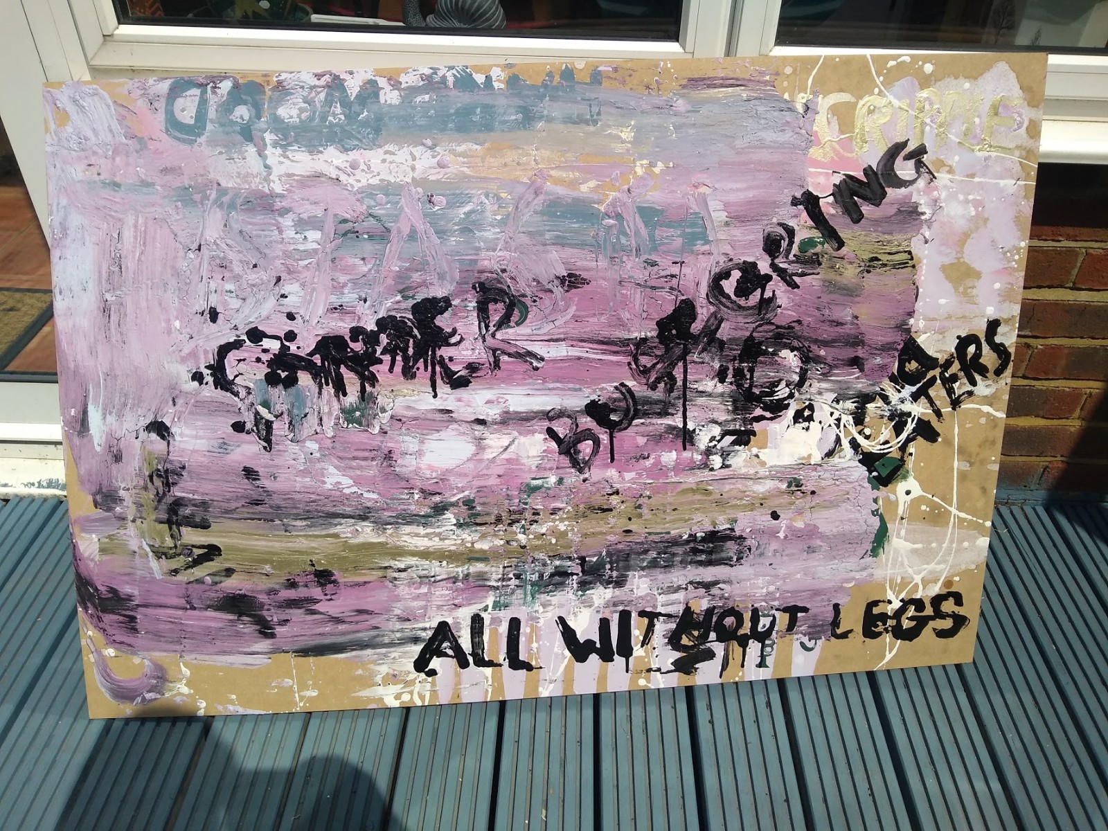 After this, when home clearing out the basement and building the studio, I gathered some materials to create another shouty word painting. Trying different methods of scraping and dripping paint, layering wet on wet and writing into it. I’m not sure I learnt much from this, but again, catharsis.