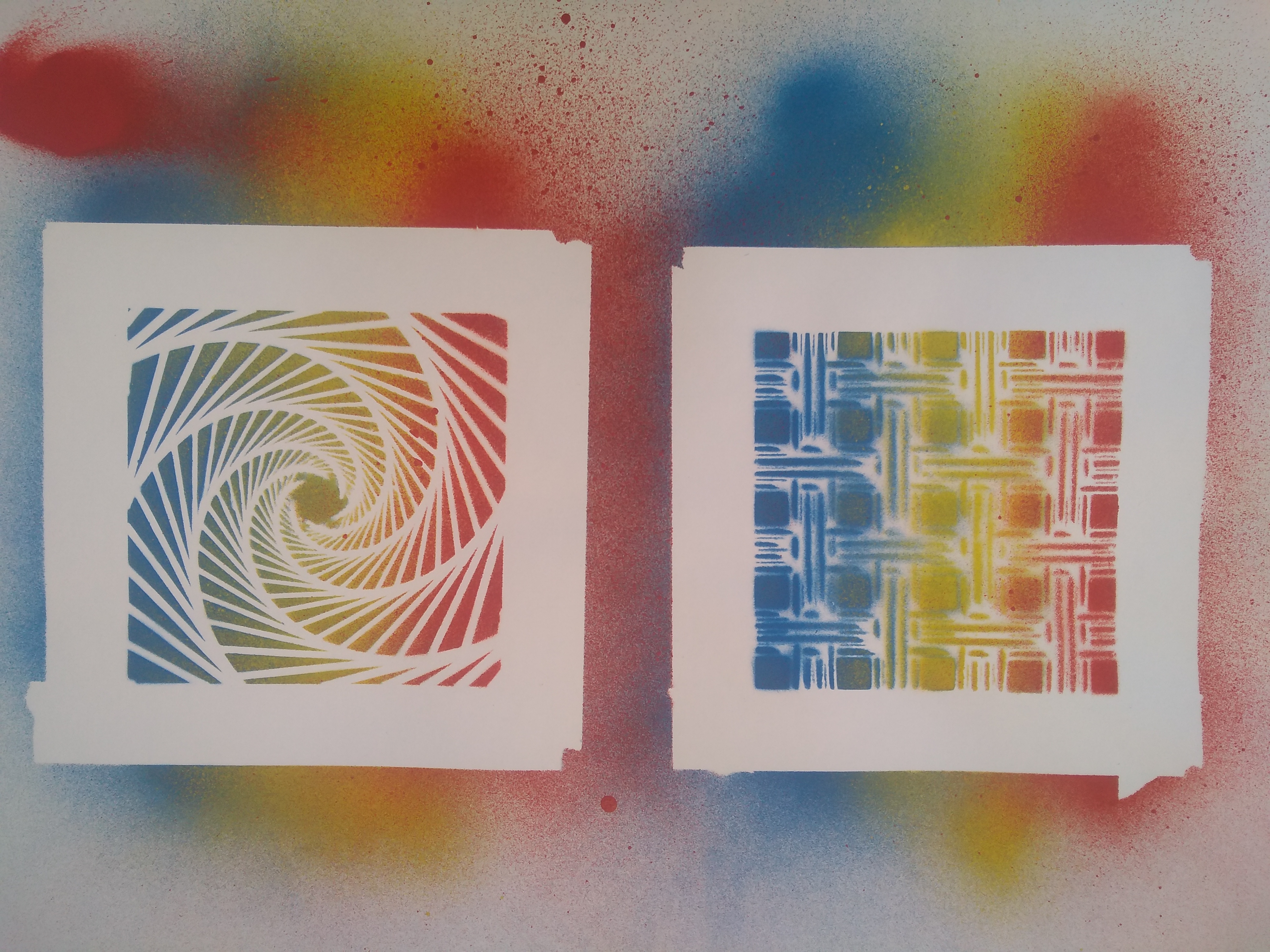 Finally, these are further creations of stencil work that I have been doing recently, messing around with colour and composition. There are a million and one ways I could adjust and change the way each stencil is used or in conjunction with other stencils or patterned on a larger sheet etc… And I will continue to do so, but for now these are what you have to enjoy. I started to name them at some point and haven’t put all the names in yet because I’m lazy and it’s already taken me like 2 weeks to write this, I’m sure you can tell the point I started tonight, it’s where everything becomes unexplained and brief, probably for the best, idk.