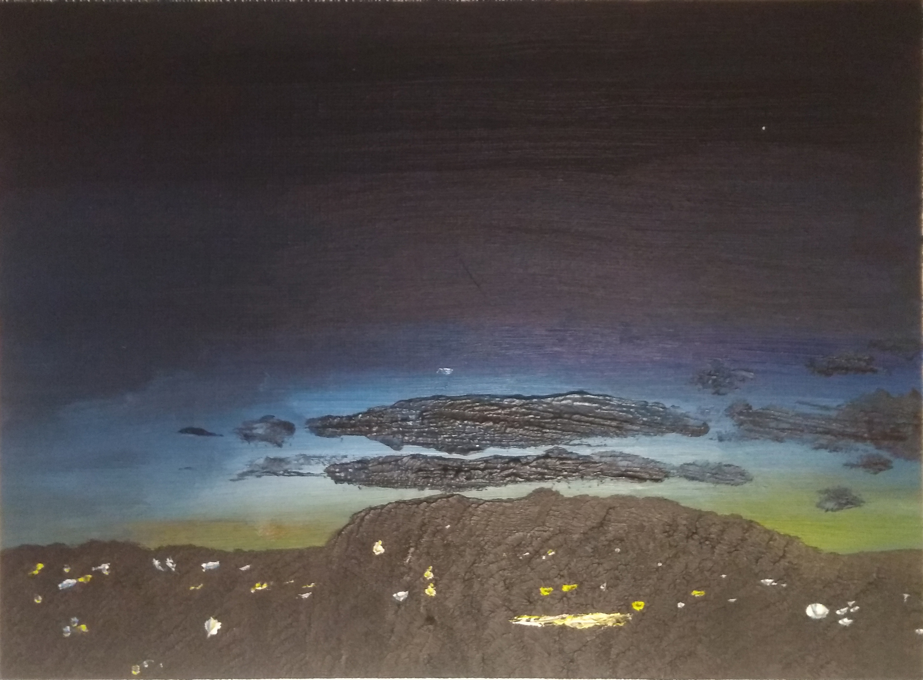 This was a little landscape inspired by waking up and seeing a beautiful sunrise glowing behind the horizon and these two clouds just floating there. It was hard to get a good photo of this without the glaring so the dark land part of the scape is a bit muted, I promise it looks better IRL.