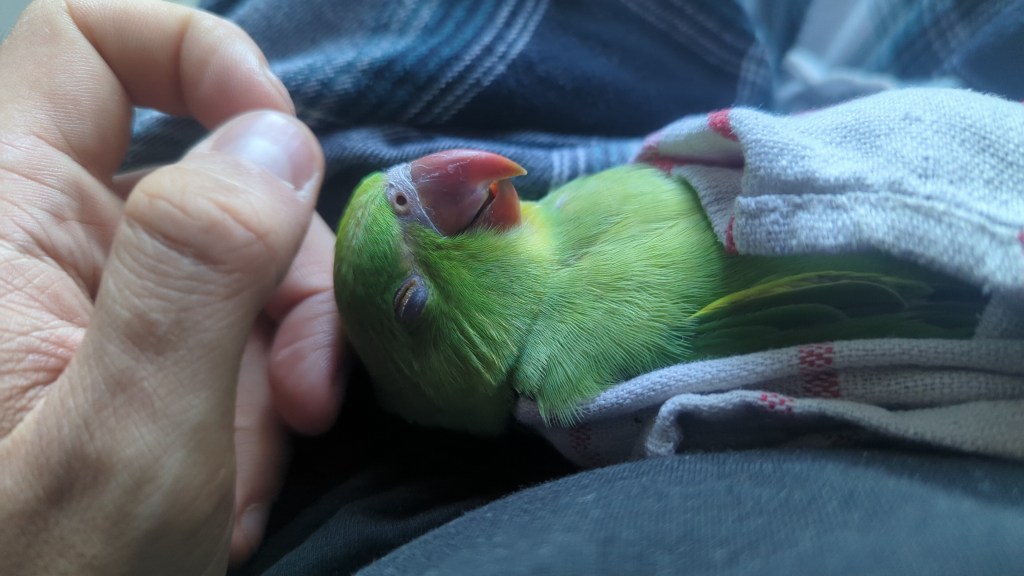 A noise was bugging me one night, and it sounded familiar in the way things do if they may have crept into your sleepy ears on previous days, a rustling. It was too much and I opened the back door that was my “window” in my room, and looking down, squashed into a little crevice between the fence and a brick was a pitiful little banana scared out of its wits. He would flap his wings but couldn’t stand up, so after summoning my own courage I trapped him in a box until the morning to save him from foxes. 5AM rolled around and I woke up too excited and curious about this bird and quickly made my way to where I’d left him outside, and looked for advice online what to do. It seemed to keep him in a shoe box with comforts and give him food and water was the best shout. He was scared, breathing fast and obviously not comfortable with me holding him, but so weak he couldn’t even make a sound or put up much resistance. With a soaked piece of toilet paper I could squeeze little droplets into his mouth and allow him a drink that must have been missing for days. After a couple of hours feeding him water, playing him happy budgie bird videos, and stroking the back of his head, my new friend felt safe enough to have a sleep in my hand. In the following days I kept feeding him water, and introducing a variety of foods, seeds, nuts, fruit, some of which he’d eat gladly, others he’d not, but it was clear that his strength was returning, he’d begin to flap in the shoebox where I kept him, and become a little more raucous when handled, but still not stand up. I followed advice online and made cycling motions with his feet, and I could feel the grip coming back to him, but again no balance, no strength. He’d lay there, on his side, in his box, flap about and make himself uncomfortable and covered in his own muck. I was determined to care for him though, and would clean him, and let him try to flap whilst holding him securely so he could have a bit of the sensation of flying without doing himself damage. Alas, after about 2 weeks, his strength was enough that he was very unhappy to be held, and would screach at the sight of me, he seemed to stop eating the tomatoes he’d loved, and kept trying to fly, though his legs still didn’t seem capable of holding him. It is with regret that I say I allowed him his wish, I took him outside, gave him a little boost and determined that if he could take to the wind, he could be free of me. Sadly, he made it over the garden fence, and then crashed into a bush. The poor banana was stuck, out of reach. He wriggled his way until the branches released him to the floor where he lay, immobile, and helpless. I had to leave him, for some cat or fox to find, and I never went back to look at the spot it was too sad for me. I wonder if I’d been more patient and disobeyed his anger if I’d have been able to get his legs working and allow him to be truly free. RIP Rodney.