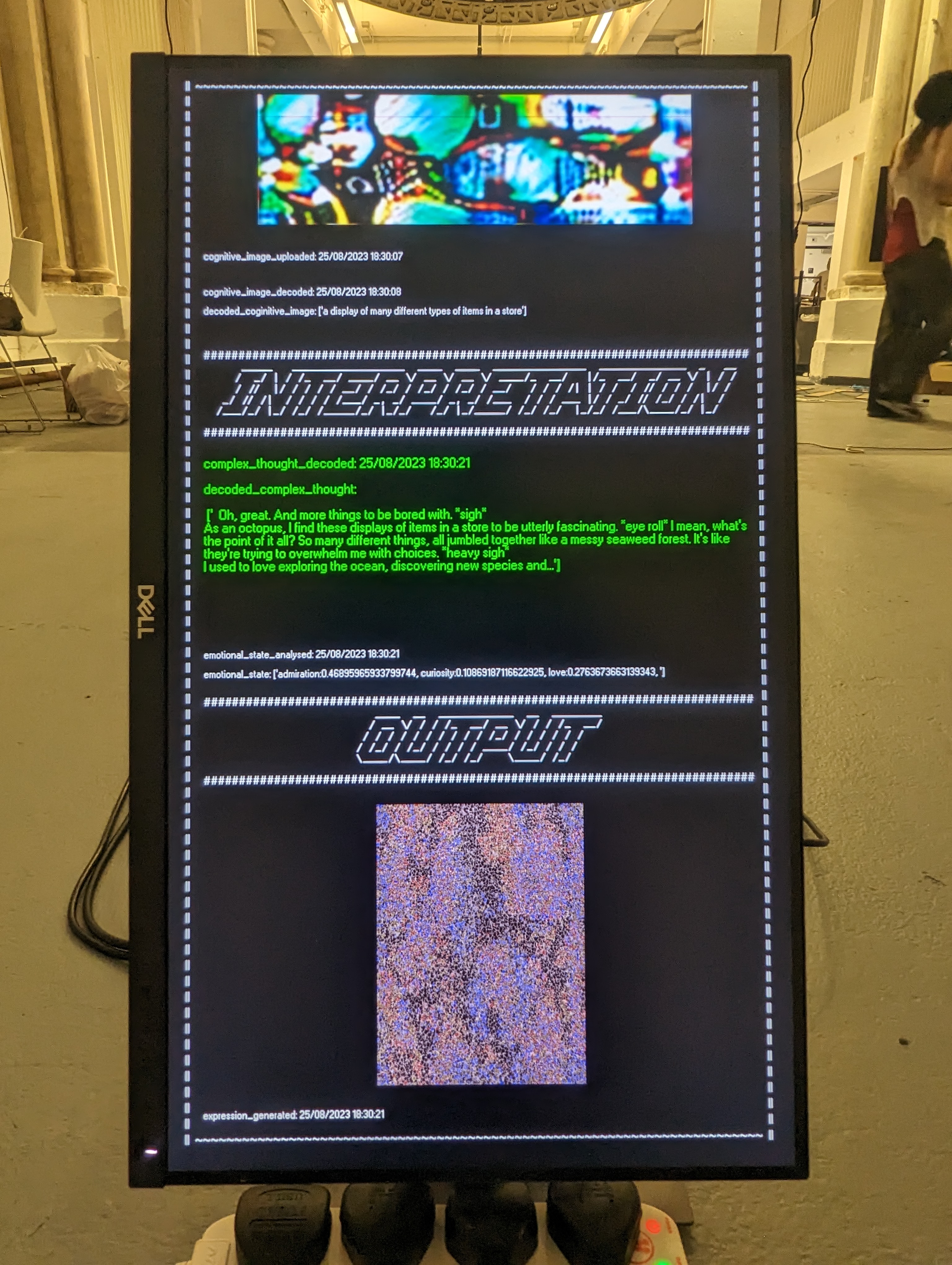 OpenCV, before passing to Ultralytics’ Yolov8 object detection model, with the Ultralytics Python library. The output of this is passed to a string that adds ‘as seen by an octopus’, to make a prompt such as ‘a person and a phone as seen by an octopus’. This prompt and the original 2 images stitched together are sent to Stable Diffusion, which outputs an abstract ‘minds eye’ image.